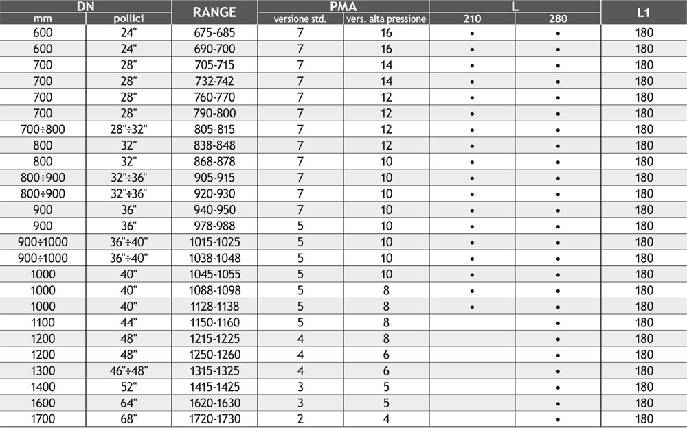 - Guarnizione di tenuta idraulica con profilo a labbro di particolare conformazione che assicura una tenuta perfetta anche con pressioni di esercizio elevate e flessioni angolari fino a 6° (in funzione dei DN e dei modelli).